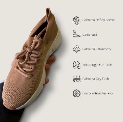 Estrutura reforçada, solado firme, suporte para arco do pé.